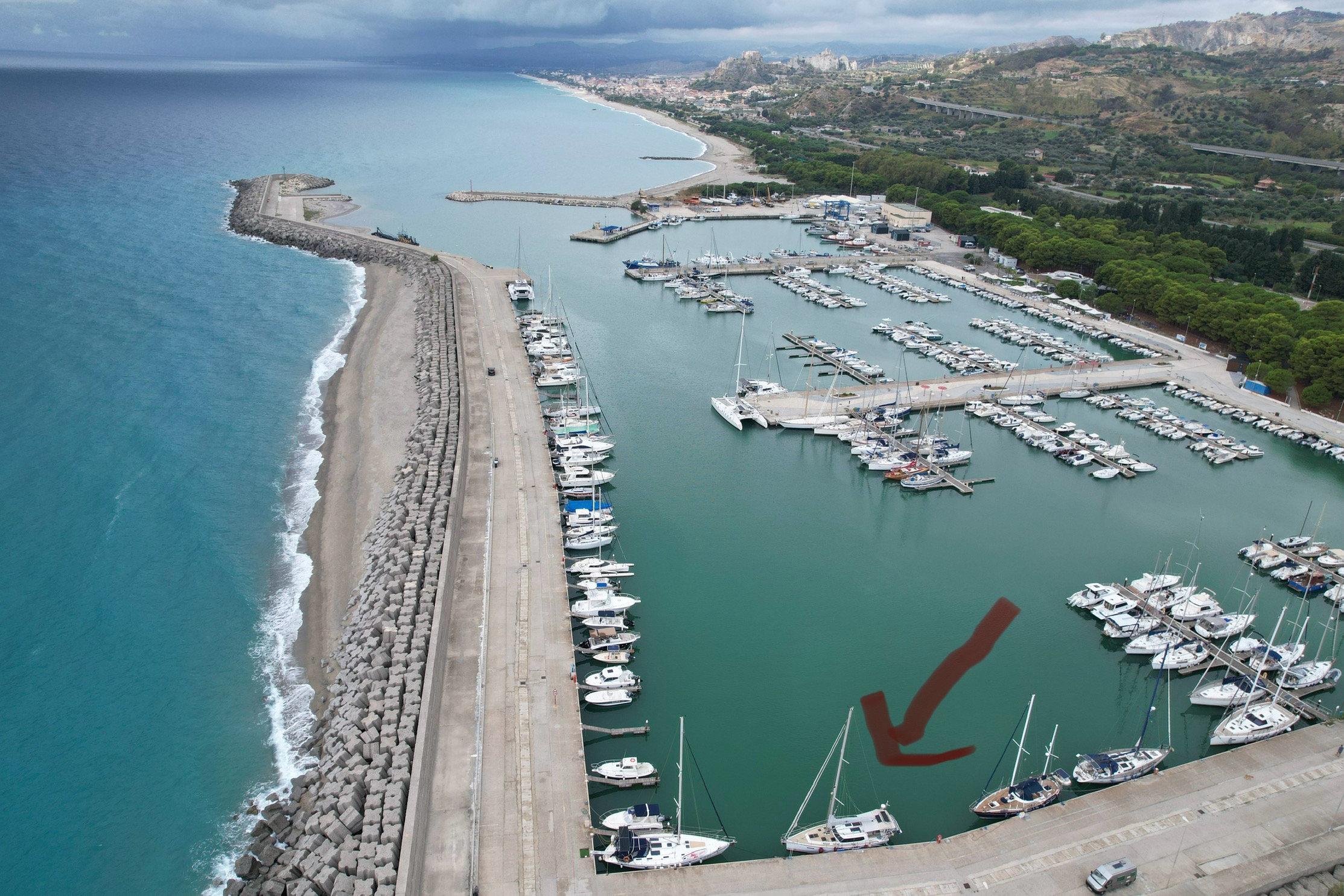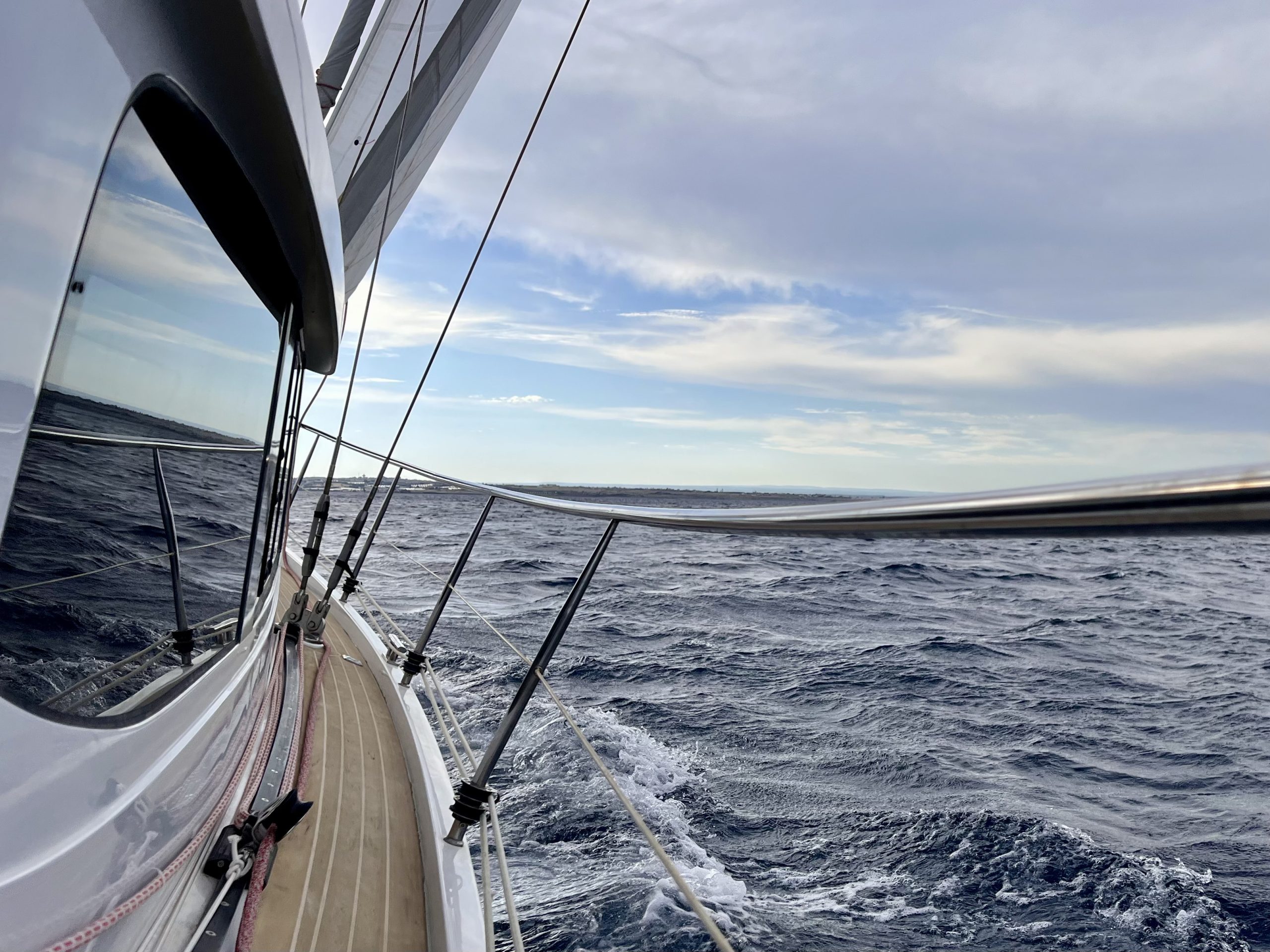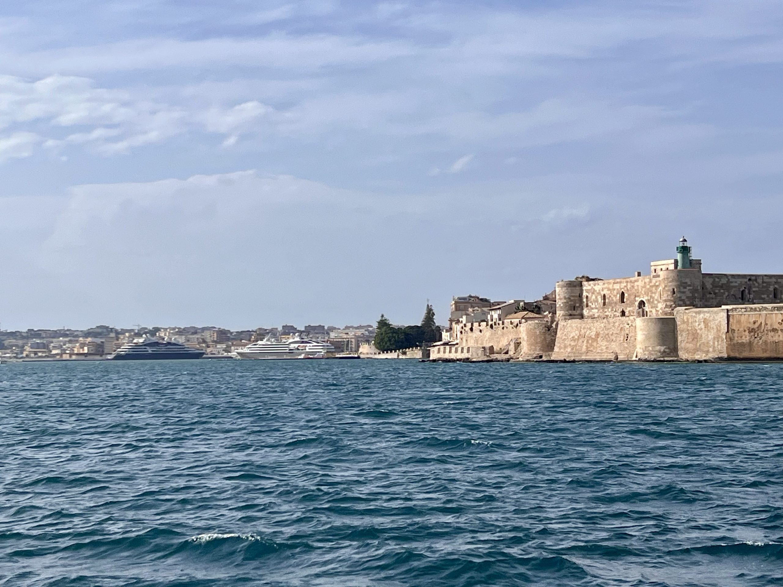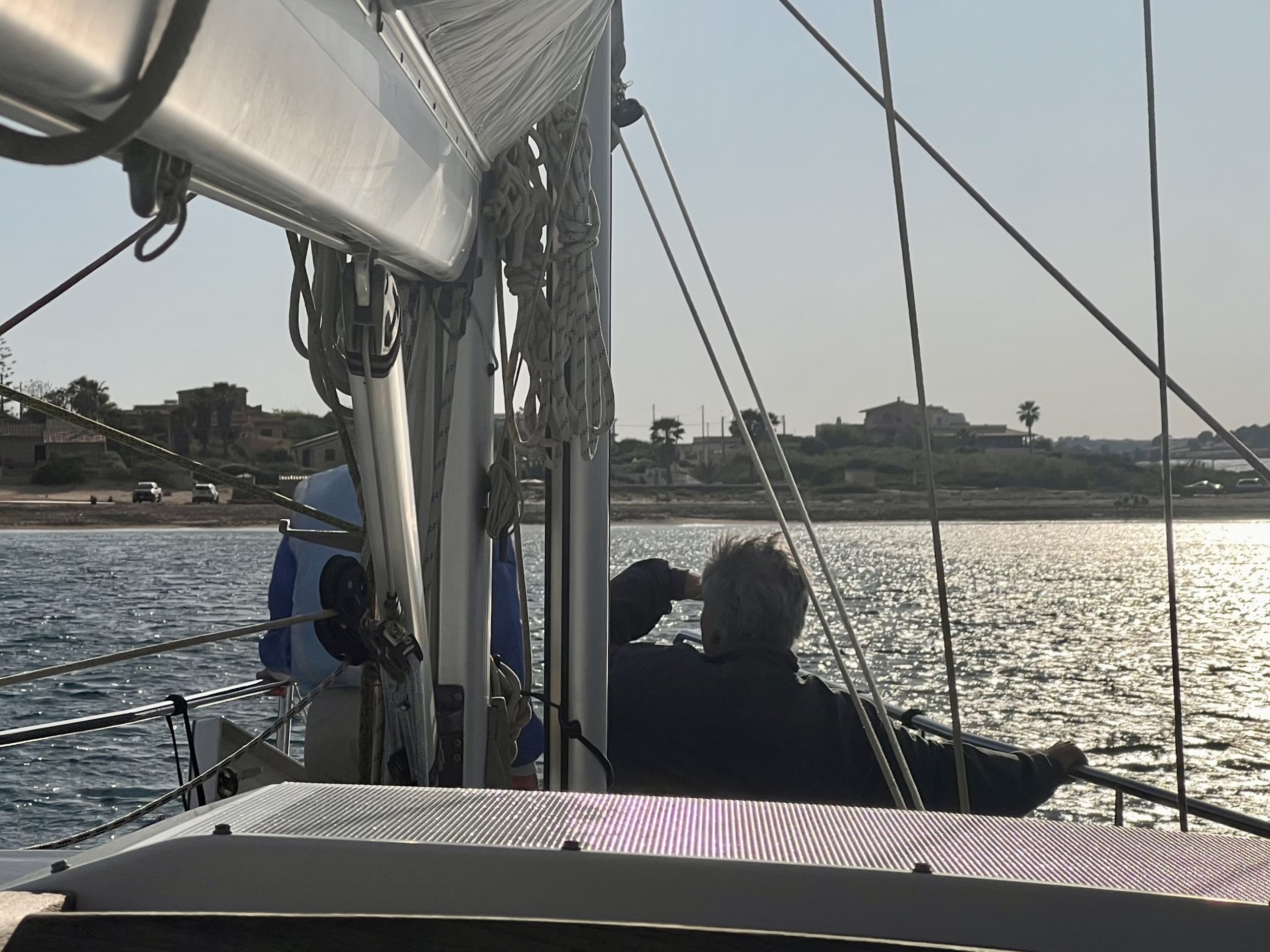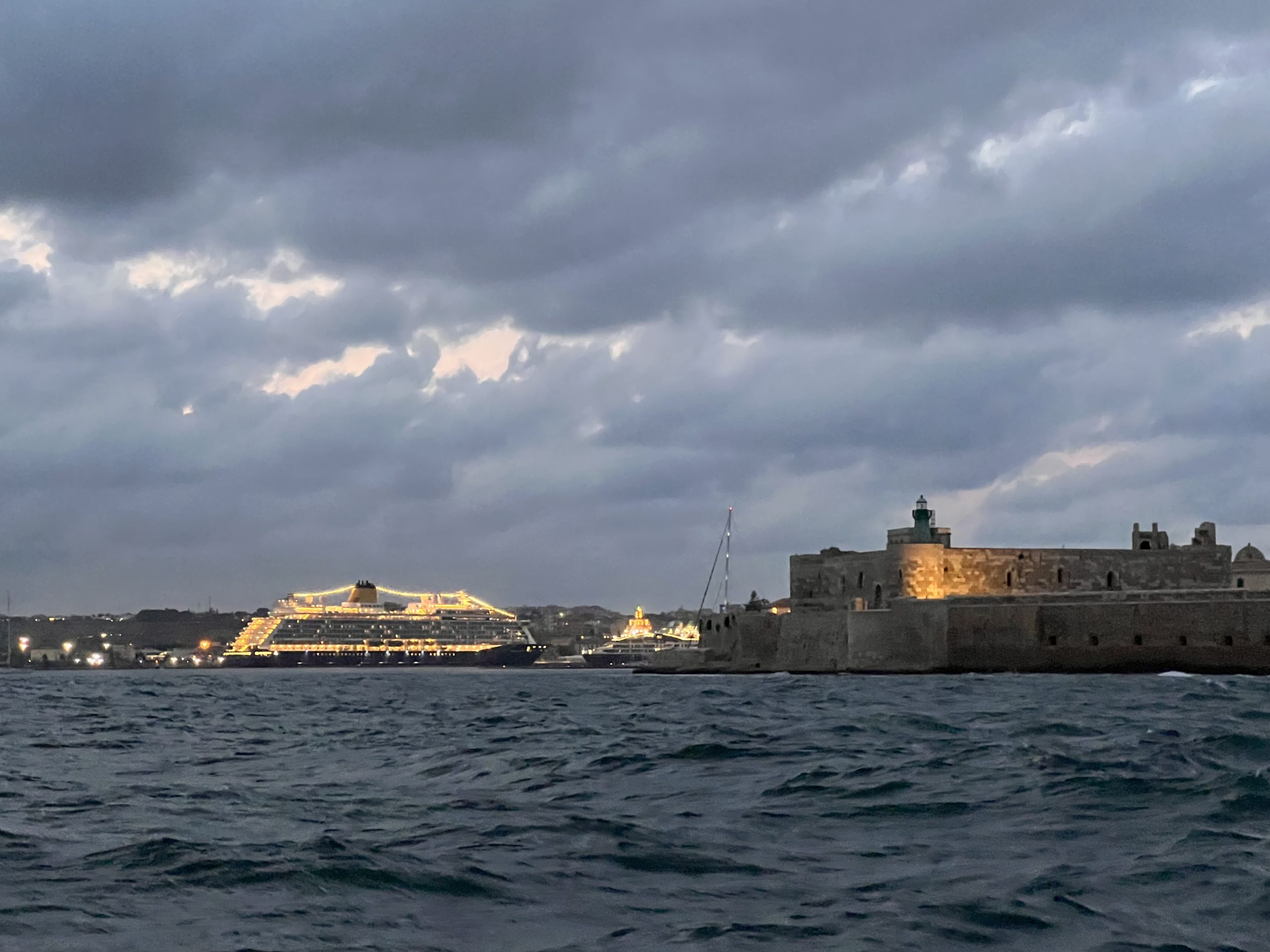 Ein Sturmtief folgt dem nächsten und die sicheren Häfen zum „Verstecken“ sind an der Kalabrischen Küste dünn gesät. In Rocella Ionica haben wir fünf Tage ausgeharrt bis wir in einem Rutsch die 90 Meilen nach Siracusa abreiten konnten. Da sind uns am Ende aber auch ein paar der bis zu drei Meter hohen Wellen achtern eingestiegen. Der Autopilot musste bei 7-8 Bft von hinten auch teilweise mit der Maschine unterstützt werden, damit die Wellen uns nicht quer legten… .
